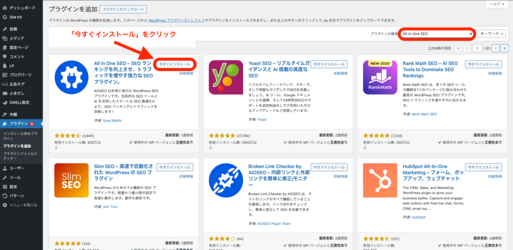 検索キーワードに「All in One SEO」と入力して、All in One SEOをインストールします。