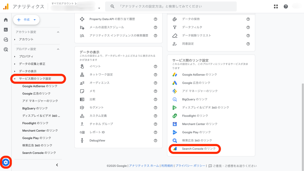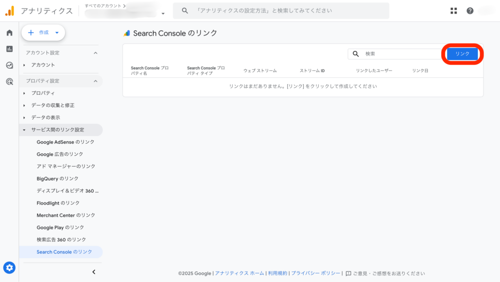 管理>プロパティ内の「サービス間のリンク設定」から、「Search Consoleのリンク」をクリックします。