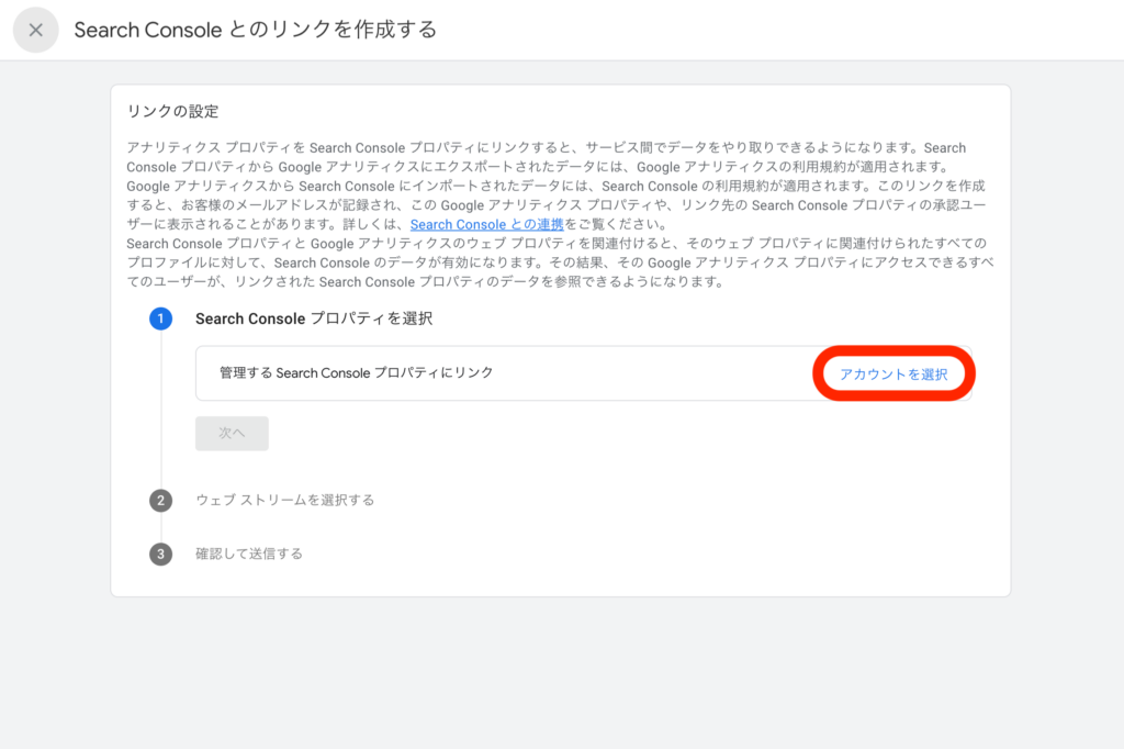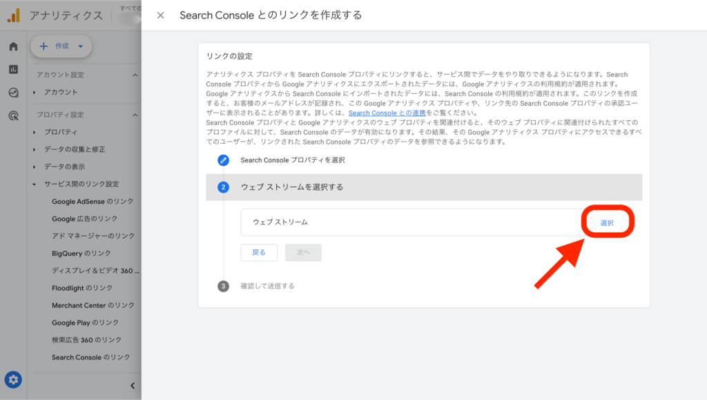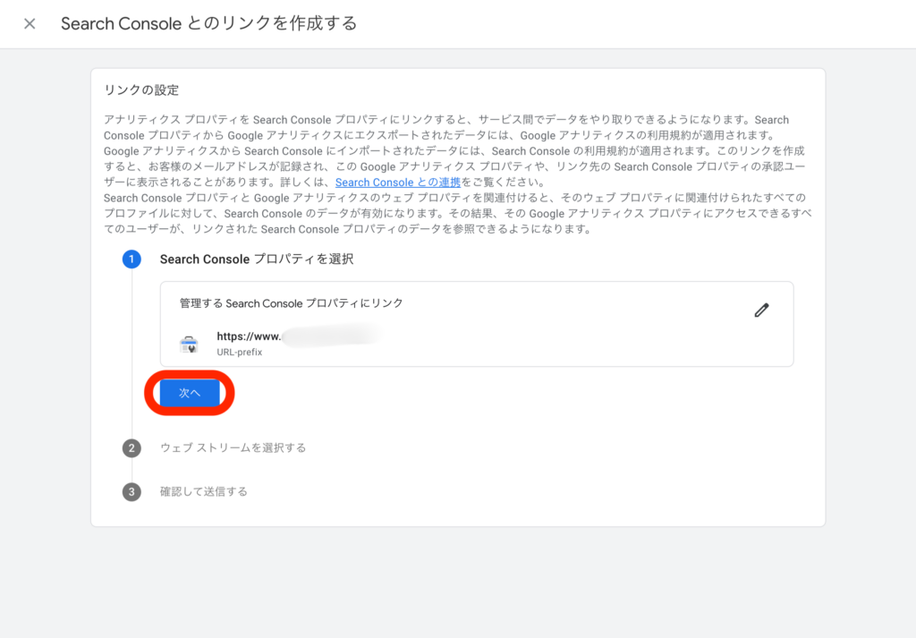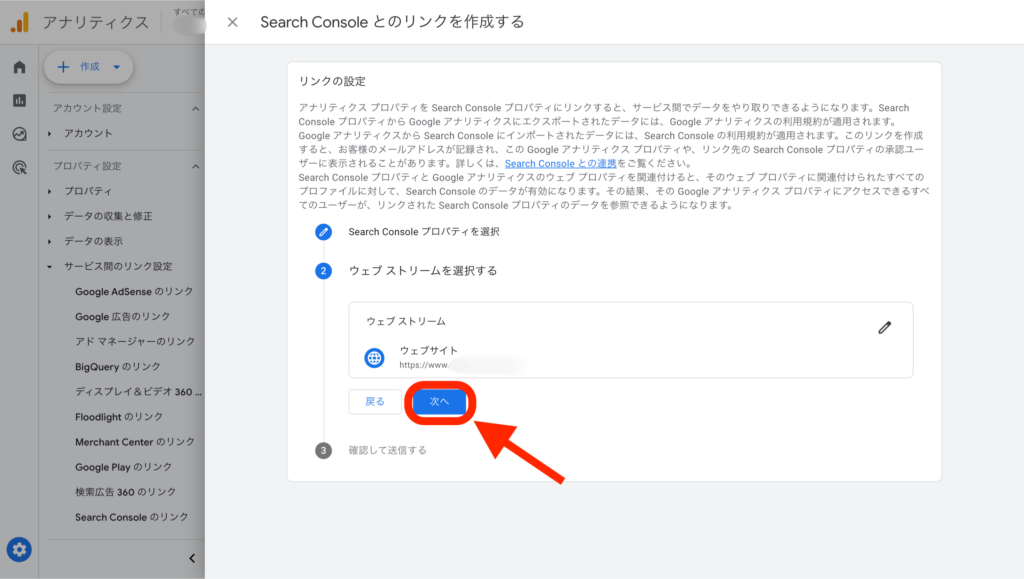 「プロパティ」と「ウェブストリーム」が選択できたら、「次へ」をクリックし確認し「送信」ボタンをクリックしたら完了です。