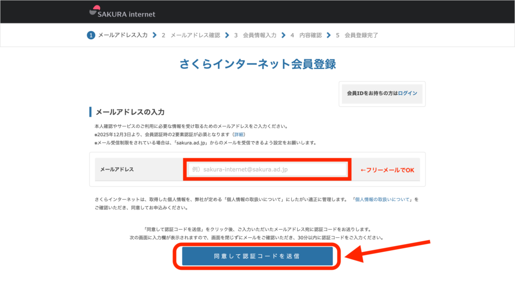 メールアドレスを入力し、「同意して認証コードを送信」ボタンクリック