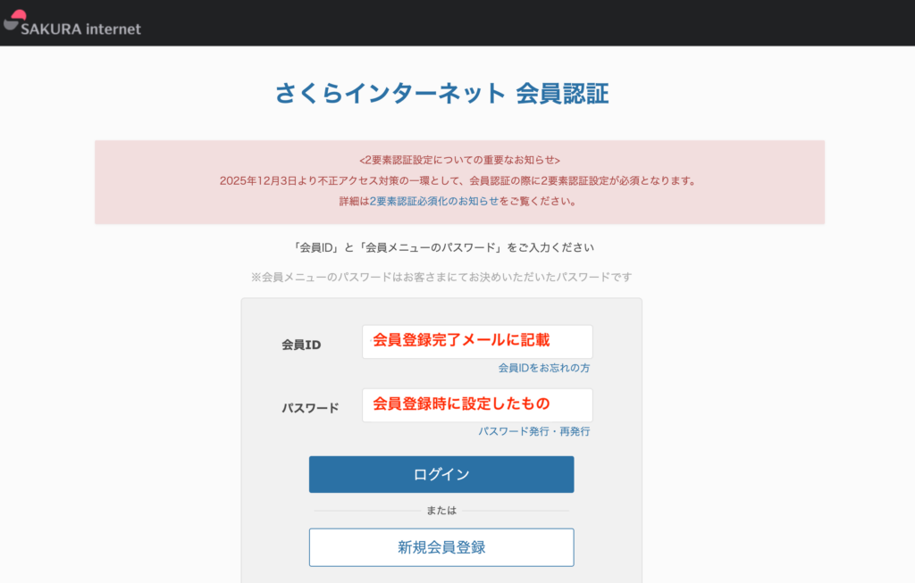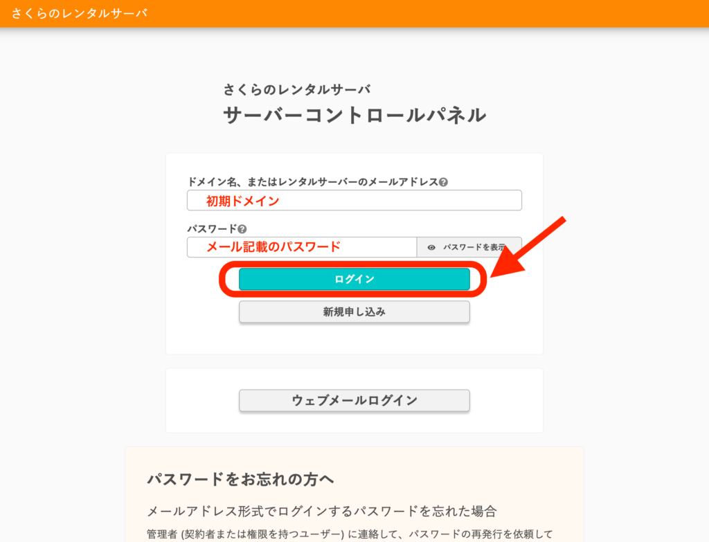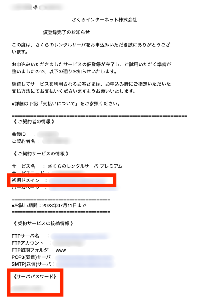 ドメイン名とパスワードは、申込時に送付されたメールの件名[さくらのレンタルサーバ] 仮登録完了のお知らせの本文内《 サーバコントロールパネル ログイン情報 》に記載されています。