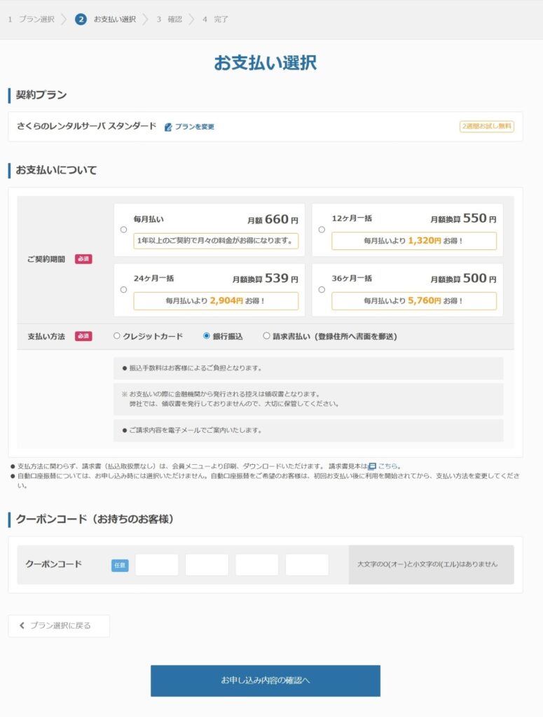 「銀行振込」「請求書払い」の場合、今回の登録後すぐにサーバーが利用できる状態にはなりますが、2週間以内に振り込みに行かなければ、キャンセル扱いになります。