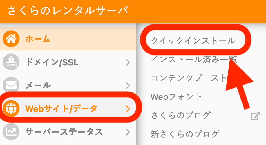 左のメニューから「Webサイト/データ -> クイックインストール」をクリック