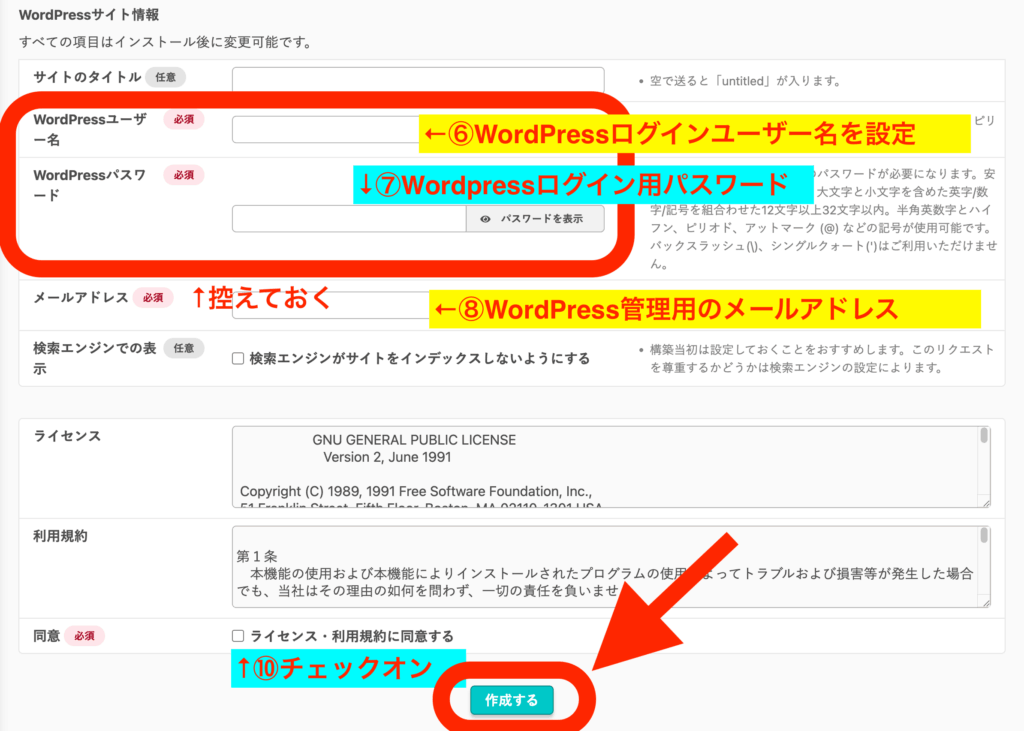 この設定で、Google等の検索に表示されなくなりますが、URLを直接指定すれば表示できます。後からWordPressの管理画面で変更できるので、最初はチェックONにしておきます。 - 「ライセンス・利用規約に同意する」をチェックON。