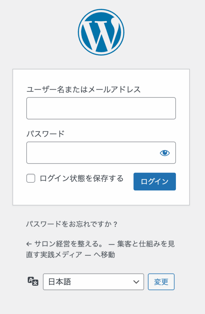 WordPressのログイン画面になります。設定したユーザー名・パスワードでログインします。