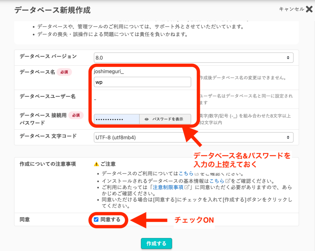 「データベース名」は例えば「wp_xxxxx」等と設定すると、後からでもWordPress用のデータベースだと分かります。(xxxxxは任意の文字列)