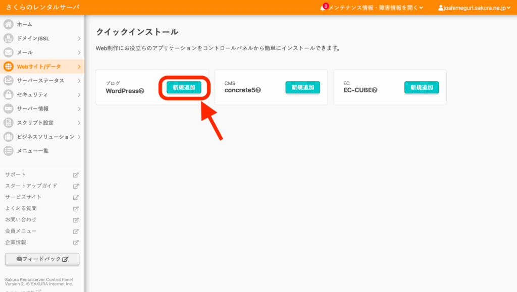 クイックインストール画面でWordPressの「新規追加」ボタンクリック