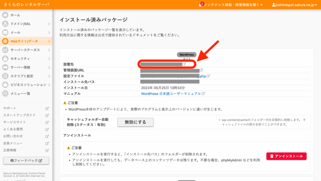 「設置先」に設定したドメインのURLが表示されているので、そこをクリック。